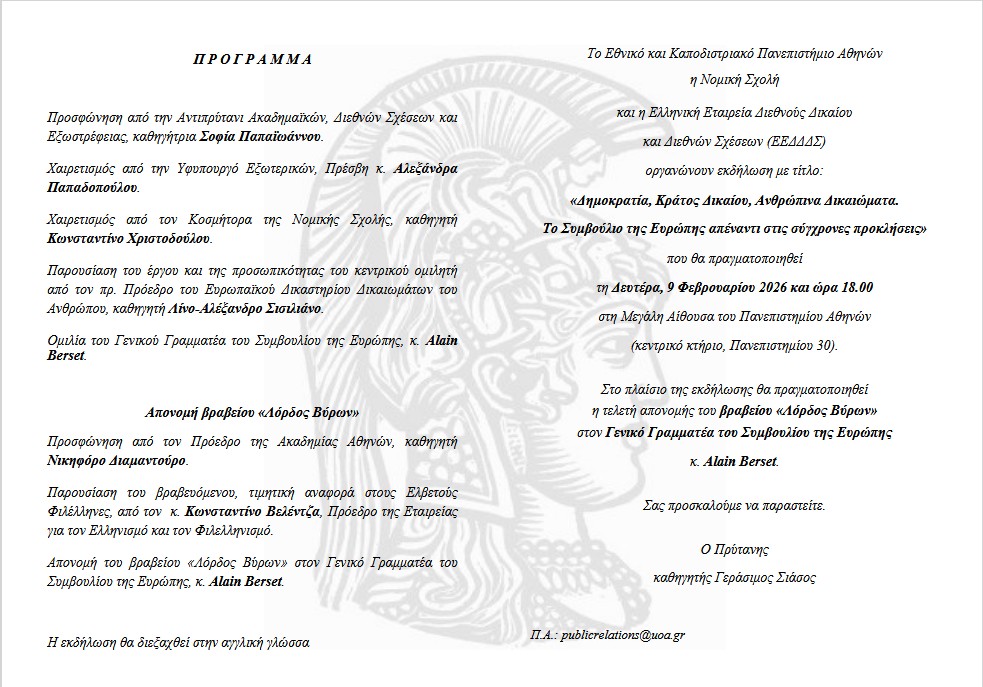 Η τελετή θα πραγματοποιηθεί τη Δευτέρα 9 Φεβρουαρίου 2026 στις 18.00 στο κεντρικό κτήριο του Πανεπιστημίου Αθηνών (Πανεπιστημίου 30, Αθήνα 10679 / Χάρτης).