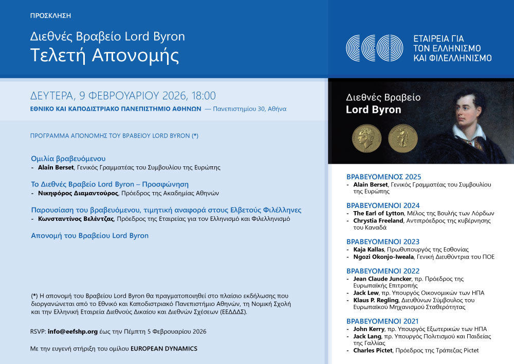 Η Εταιρεία για τον Ελληνισμό και Φιλελληνισμό (ΕΕΦ) έχει θεσμοθετήσει από το 2021 το Διεθνές Βραβείο Φιλελληνισμού Lord Byron στο όνομα του σπουδαίου ποιητή και Φιλέλληνα, Λόρδου Βύρωνα.
