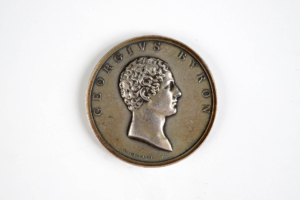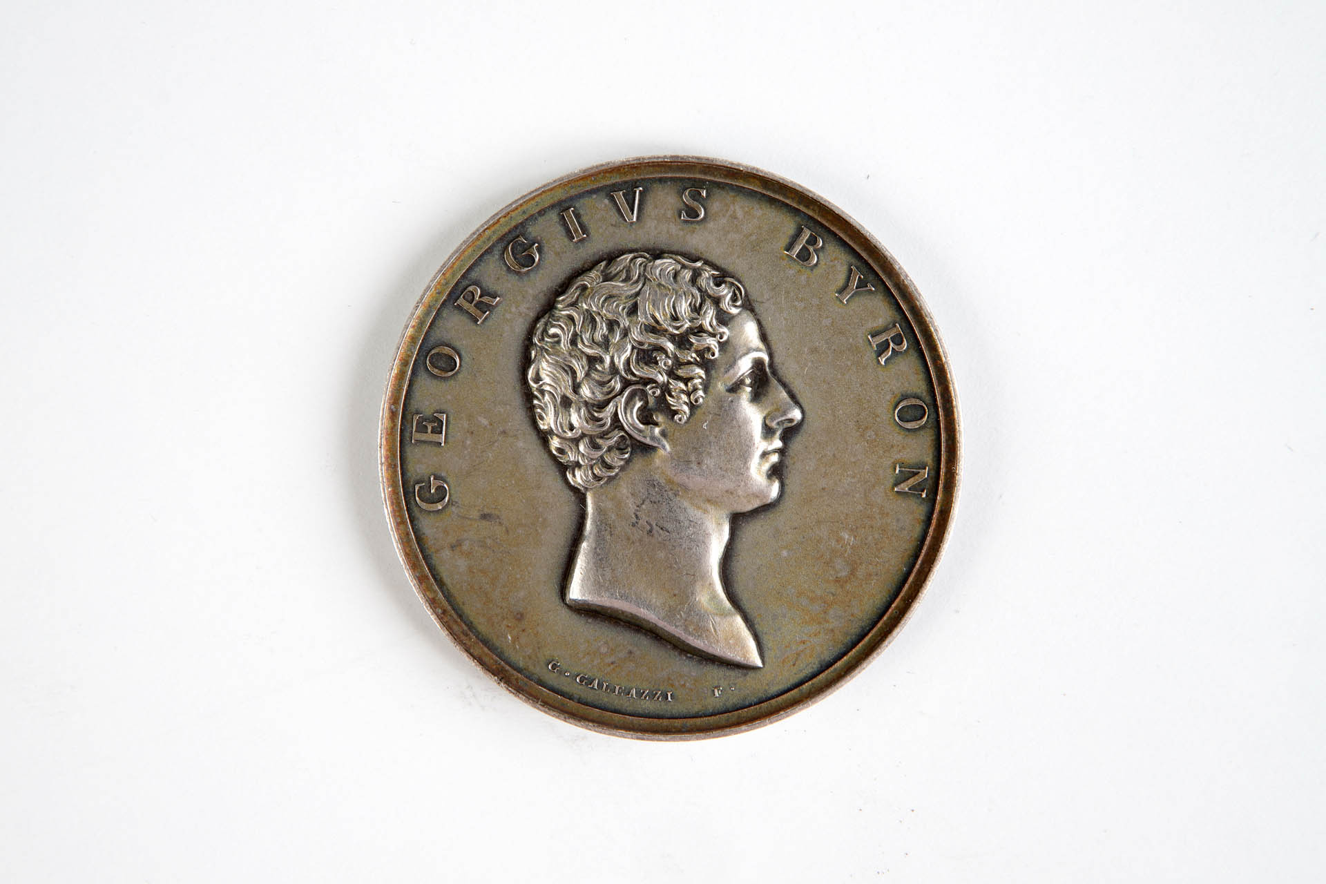 G. Galeazzi, Medal with Lord Byron. Lord Byron’s head along with the inscription ‘GEORGIVS BYRON’ on one side; Apollo with his right foot on a funerary barge and the inscription ‘AGITANTE CALESCIMVS ILL’ (We Grow Enthusiastic from His Inspiration) on the other side. Italy, 1840. Bronze, diameter 55 mm. (a)