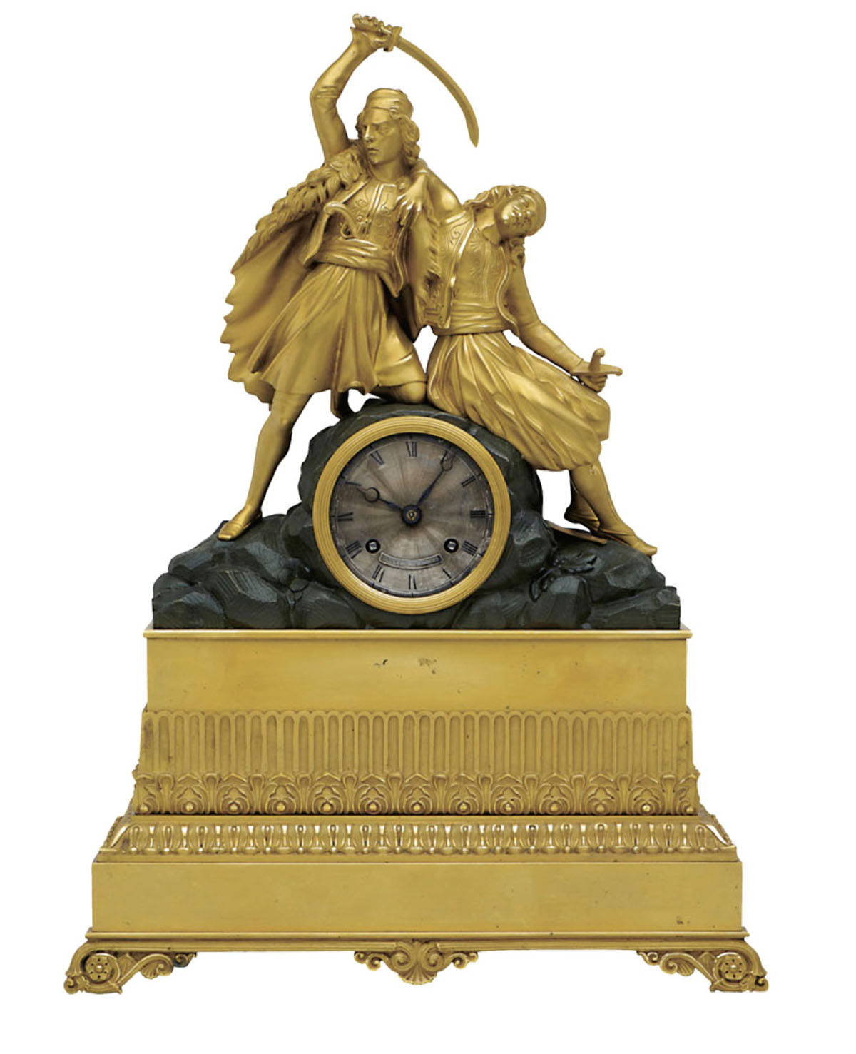 μηχανισμός με την ένδειξη: Danet H(orloge)r à Rennes (στο καντράν) επιχρυσωμένος και πατιναρισμένος μπρούντζος, ύψος: 46,5 cm. Ανάλογο θέμα απεικόνισε ο Ary Scheffer στο έργο του Jeune Grec défendant son père, και άλλοι ζωγράφοι του 19ου αιώνα.