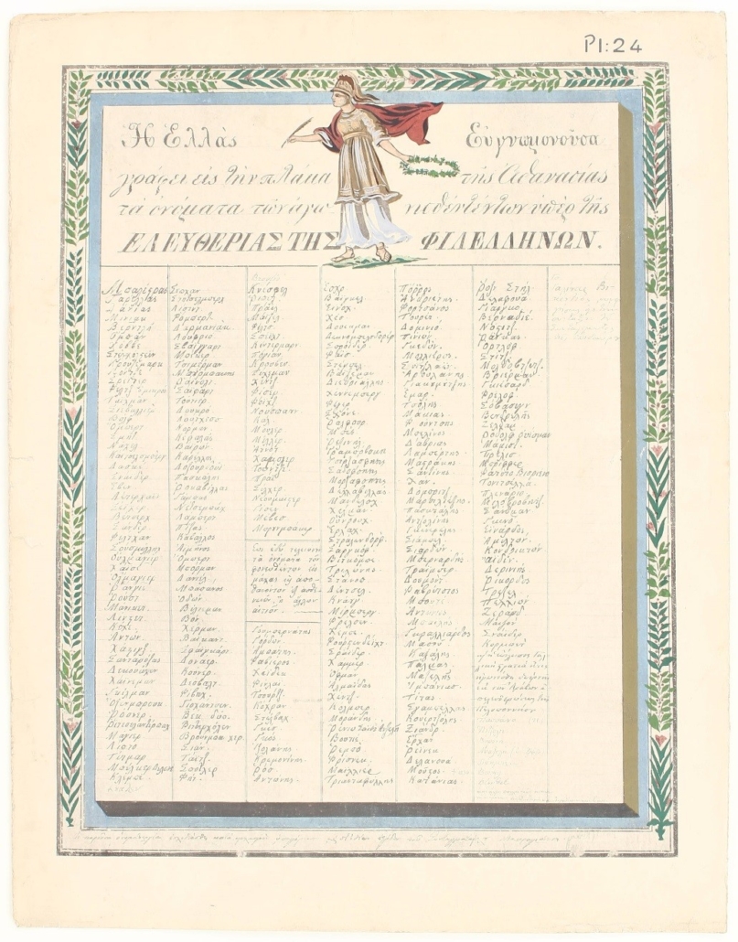 Ο Στρατηγός Μακρυγιάννης κάλεσε τον αγωνιστή και ζωγράφο του 1821, Παναγιώτη Ζωγράφο, μαζί με τους δύο γιους του, να εικονογραφήσουν τις μεγάλες στιγμές της ελληνικής επανάστασης του 1821. Ένας από τους 25 πίνακες καταγράφει τα ονόματα των βασικών Φιλελλήνων που πολέμησαν στην Ελλάδα κατά τη διάρκεια της Επανάστασης.