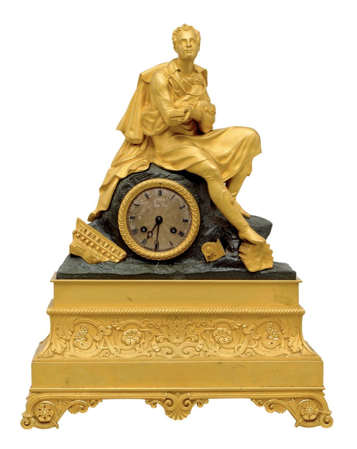Ρολόι με το Λόρδο Βύρωνα (β΄ τέταρτο 19ου αιώνα). Άγγλο ρομαντικό ποιητή και μεγάλο φιλέλληνα. Εγκαταστάθηκε στο Μεσολόγγι και άρχισε να οργανώνει στρατιωτικά σώματα με δικά του έξοδα. Πέθανε στις 19 Απριλίου 1824 στο Μεσολόγγι μέσα σε γενικό πένθος. Ήταν ο πλέον διάσημος και αναγνωρίσιμος άνθρωπος της εποχής του, ο οποίος βοήθησε με την ταύτισή του με τα δίκαια των Ελλήνων καθοριστικά την Επανάσταση του 1821 και την απελευθέρωση της Ελλάδος.